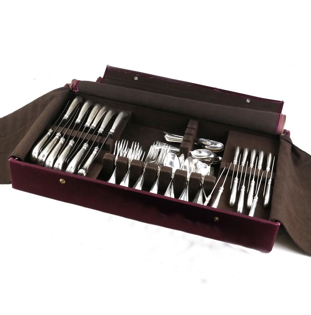 Sold84 PCS JAMES ROBINSON SILVER FLATWARE, 2,296gModern English silver flatware service in the Early English pattern, full 10 piece place setting for eight. Various dates, all pieces hallmarked for London and Sheffield, as well as for JamesRobinsonSee Sold Price