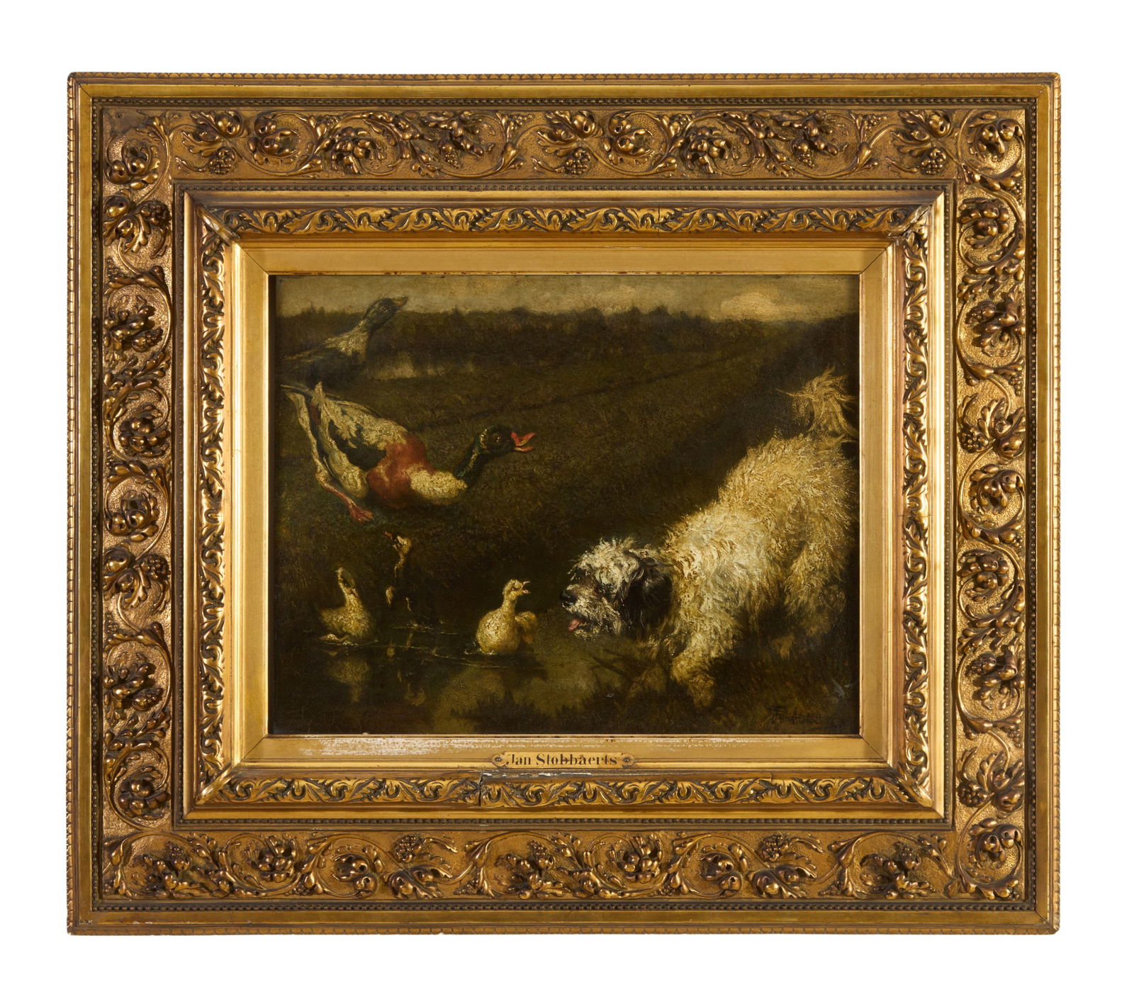 Jan Stobbaerts (Belgian, 1838-1914), "Ducks Protecting Their Family from Dog," H.- 14 in., W.- 18