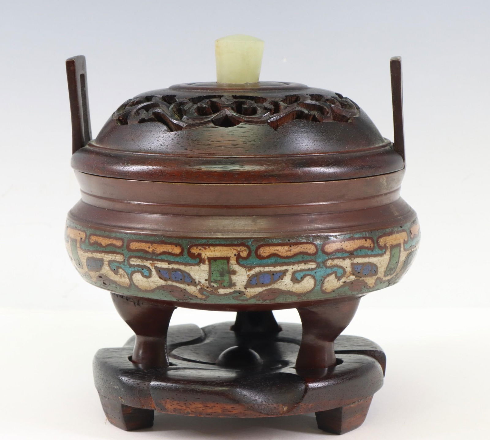SoldBRONZE AND CHAMPLEVE ENAMEL CENSERJapanese. 20th Century. With archaic animal finial. Height 7 1/8". (50/500) Note: This lot is being re-offered for sale due to the fact that Marie Petti and Gary Kokot of 239 Preserve Court, Royal PalSee Sold Price