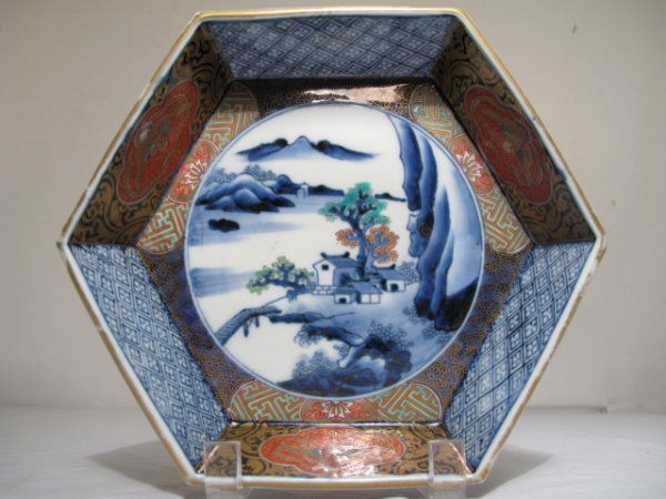 JAPANESE IMARI HEXAGONAL DISH WITH LANDSCAPE