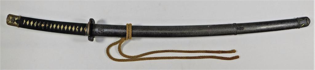SoldShowa Period Japanese Katana with MeiShowa Period Japanese Katana with Mei World War II 28.7" Nagasa (Blade Length). 38.8" with Tsuka (Hilt) and Saya (Scabbard). Shinogi-Zukuri pattern blade with Toran style Hamon line and mounting GoldSee Sold Price