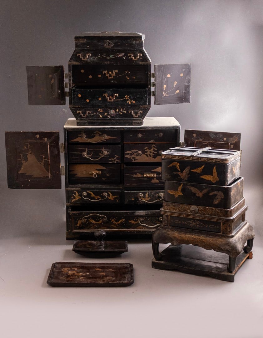 LOT OF THREE CHINESE VINTAGE JEWELRY BOXESMar 01, 2026Estate Lot of 5 Antique Chinese & Bronze: Box, Bottle, Tray, Vase & Leather WalletMar 15, 2026(5) JAPANESE BLACK LACQUER PAINTED TABLE BOXES1 day LeftSIX ASSORTED ANTIQUE WOODEN BOXESMar 07, 2026(4) JAPANESE LACQUERED TABLE BOXES, 1 WITH MOP INLAY7 hrs LeftAntique lap desk, Chinese lacquer jewelry box, and more boxes6 days LeftRussian Kholuy Lacquer Fairy Tale Jewelry Box6 days LeftA pair of exquisite hand-painted and gilded lacquer boxes from a rare collection.6 hrs LeftA Chinese Lacquer Writing Box with Inlaid PanelsFeb 28, 2026A Japanese Lacquer BoxMar 01, 2026Antique Chinese Black Lacquer And Mother Of Pearl Inlaid Jewelry Box2 days Left(R) A LACQUERED SUZURIBAKO (WRITING BOX) AND TABAKOBON (PORTABLE BRAZIER SET) , JAPAN 19TH CENTURY1 day LeftRare Antique Collection Wooden Lacquer Ware Hand-painted Gilded Antique Rack (Pair)Feb 27, 2026(R) A JAPANESE LACQUER CABINET (KODANSU), MEIJI PERIOD, 19TH CENTURY1 day LeftAn Exquisite Black Lacquer Painted Gold Landscape Pattern Box4 days LeftJAPANESE LACQUER CURIO CABINET WITH PORCELAIN DRAWER3 days Left