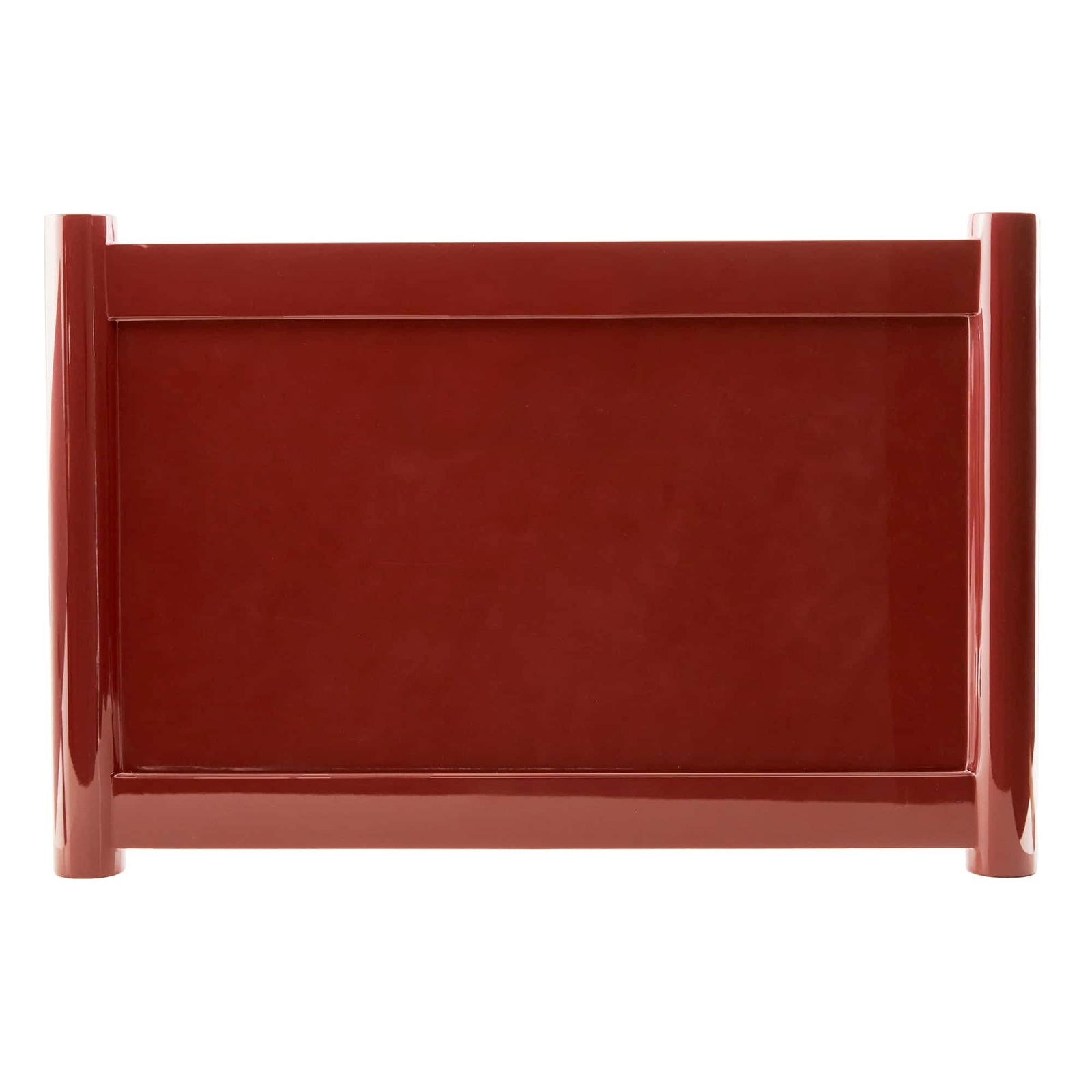 SoldJAPANESE LACQUERED TRAYred with bird and wave decoration, with straight rim Condition: with some areas of loss to lacquer 22 inches wide; 14 1/4 inches deep; 1 3/8 inches highSee Sold Price