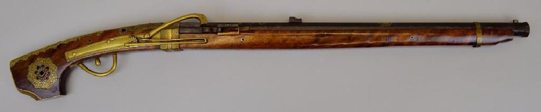 SoldJAPANESE MATCHLOCK MUSKET.Japan, Edo Period (1603-1868). Full stock, octagonal barrel with incised and gilt characters and dragon. Brass trigger, hammer and pan guard. Some wear, ramrod has end loss. 57"l.See Sold Price