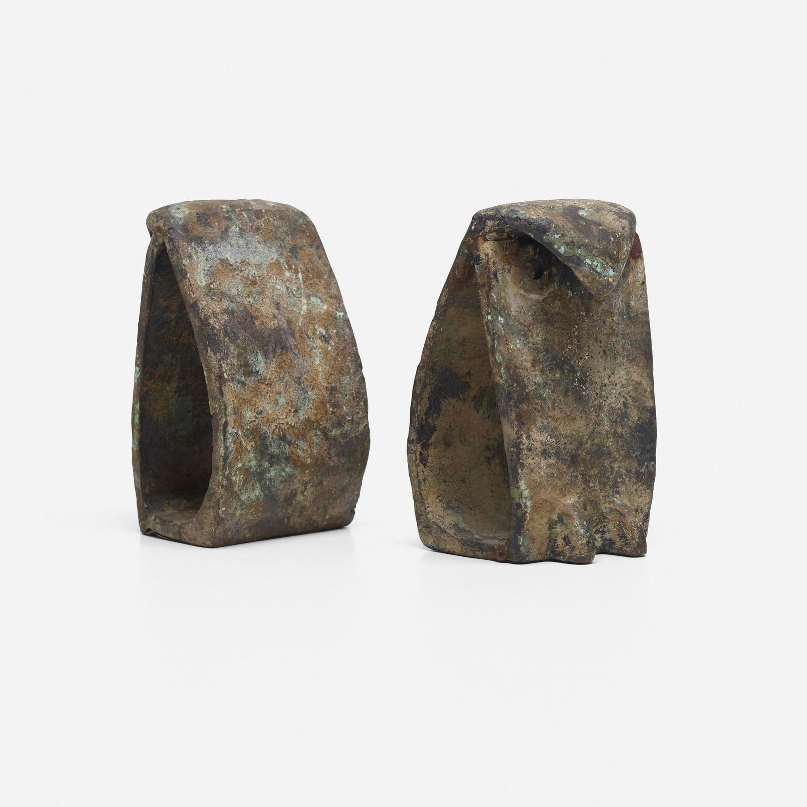 SoldIsamu Noguchi Style Owl BookendsIsamu Noguchi Style Owl Bookends. Japan, 1950s. Iron with applied gilt and green verdigris. 3 1/2w x 3 1/2d x 5 3/4h.See Sold Price