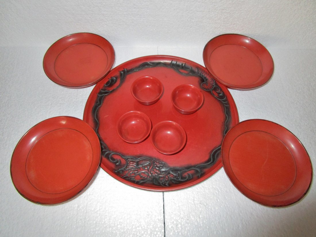 SoldJapanese Meiji Tea Set - Japanese red lacquered square plate with 6 small tea plates, three bowlsTitle: Japanese Meiji Tea Set - Japanese red lacquered square plate with 6 small tea plates, three bowls and a box with lid Origin: Date/Period: 19th C Materials: wood Description: size: 1 5/8"H x 10See Sold Price