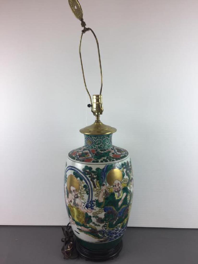 Japanese style Table Lamp with Small Bow tie joinery. Dark stained wood frame with red fabric shade.Japanese style Table Lamp with Small Bow tie joinery. Dark stained wood frame with red fabric shade. Dimensions: Height: 27.5 inches, Width: 10.75 inches, Depth: 8 inches. --- - - We offer curbside de