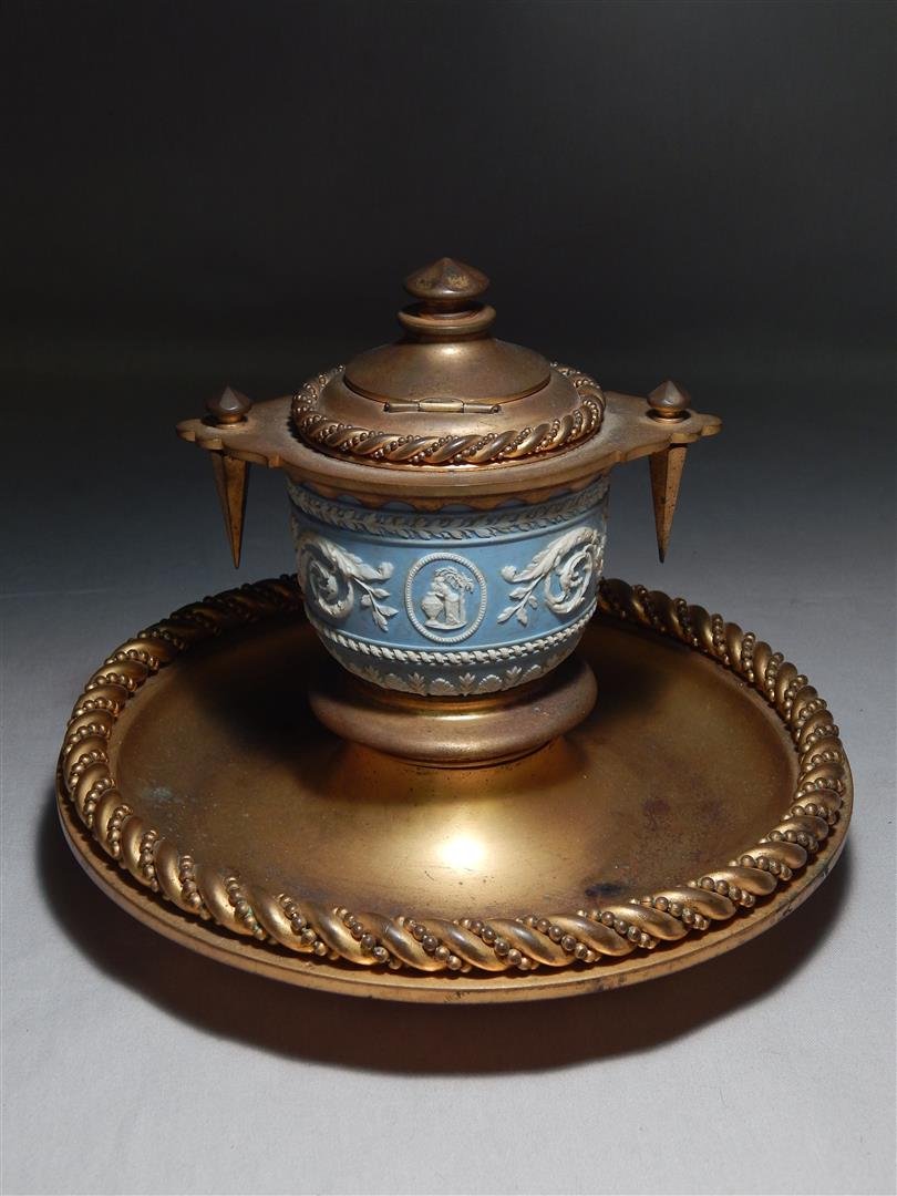 SoldA Brass Inkwell.A Brass Inkwell. Hand crafted inkwell comprising an ooid base with applied "garbage can" that contains the clear glass inkwell insert. Behind this is a "wall" from which a rat is coming through, and gSee Sold Price