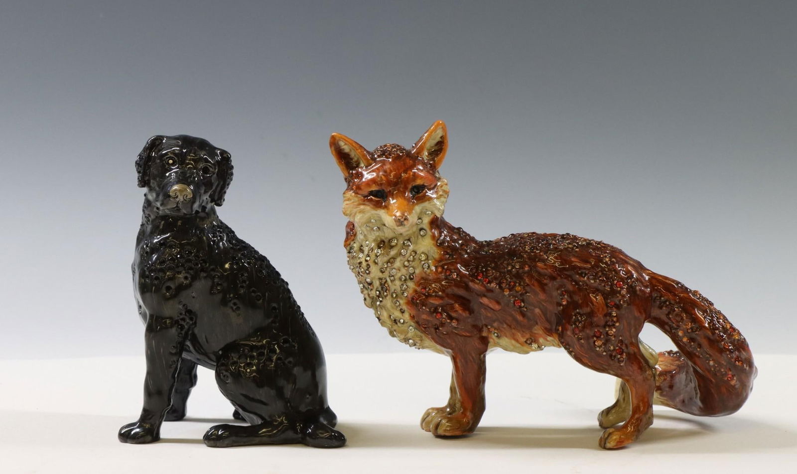 SoldJay Strongwater FigurinesEnameled animals set with Swarovski crystals, including a fox numbered 291 of 300, and a Black Labrador dog. Fox 4.5"h x 5.5"wSee Sold Price
