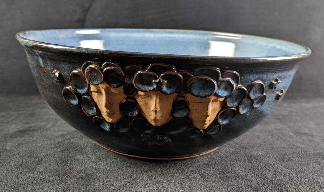SoldJB Pottery Three Faces Large BowlHere is a large blue pottery bowl that has three faces that peer out from blue textured circles. The blue bowl is signed by the artist on the bottom of the bowl. The bowl is approx 14 5/8" x 15" x 6"See Sold Price