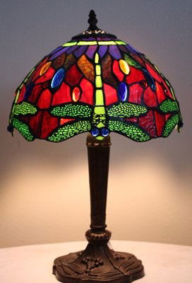 SoldStained Glass Dragonfly LampAn Art Nouveau style dragonfly stained glass lamp. This lamp is incredibly high quality and is in the style of the popular Tiffany studios design. Shade features jeweled chunk decoration and metal oveSee Sold Price