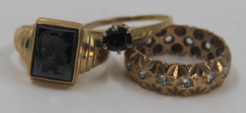 SoldJEWELRY. Assorted Gold Ring Grouping.Includes a 14kt yellow gold ring with central faceted green gem flanked by diamond accents, size - 5 1/4, wear to facets; a 14kt yellow gold with central oval Chrysoprase? cabochon with openwork surroSee Sold Price