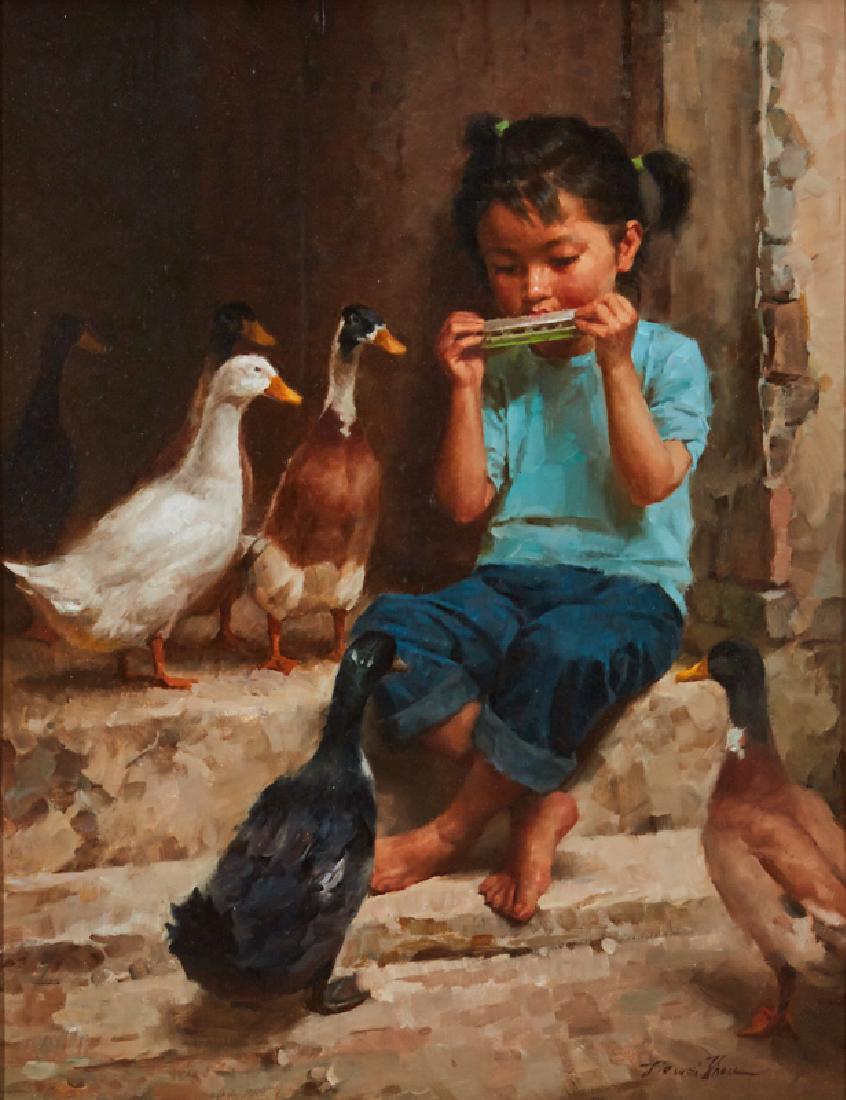 SoldJIE WEI ZHOU (Chinese b. 1962) A PAINTING, "Lunchtime," 21ST CENTURY,JIE WEI ZHOU (Chinese b. 1962) A PAINTING, "Lunchtime," 21ST CENTURY, oil on canvas, signed L/R in characters and letters, "Jie Wei Zhou," label on reverse from Jackson Hole Art Auctions, Jackson, WyoSee Sold Price