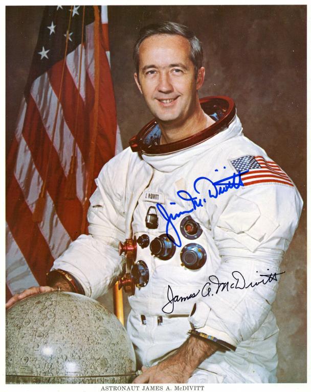 SoldJim McDivitt Signed PhotoApollo 9 commander Jim McDivitt signed photo. Green ink. 8x10" color. ***Lot 14 guarantees the authenticity of these autograph(s). Please see Terms and Conditions. ***See Sold Price