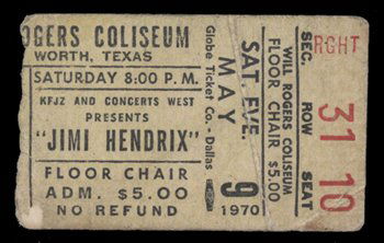 Jimi Hendrix Forth Worth Texas ticket, 1970
