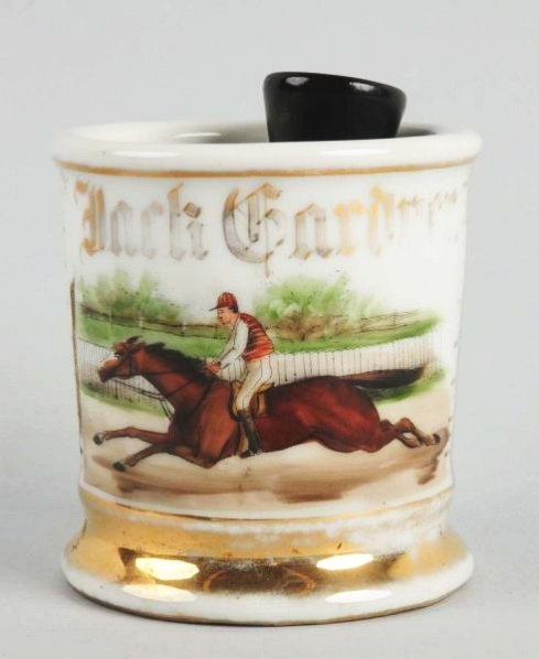 SoldJOCKEY'S SHAVING MUG.Has the name "Dirk" in gold gilt across the top. Mug is signed "W. B. S. Company" under base. Beautiful image of man riding on horse. Condition: (Excellent). Dimensions: 4 - 3/4" x 3 - 1/2" x 3 - 3/4"See Sold Price