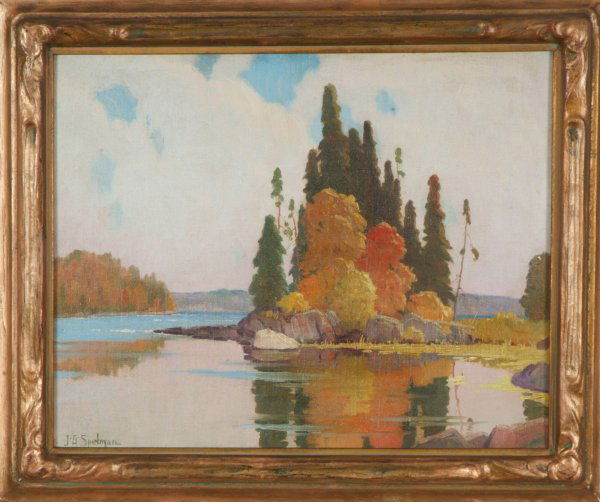 SoldJOHN SPELMAN "A MORNING MELODY" LANDSCAPE O/BJohn Adams Spelman (American 1880-1941), "A Morning Melody", oil on board, signed lower right. Chicago Galleries Association label to verso. Fall mountain landscape scene. Accompanied by artist pamphlSee Sold Price