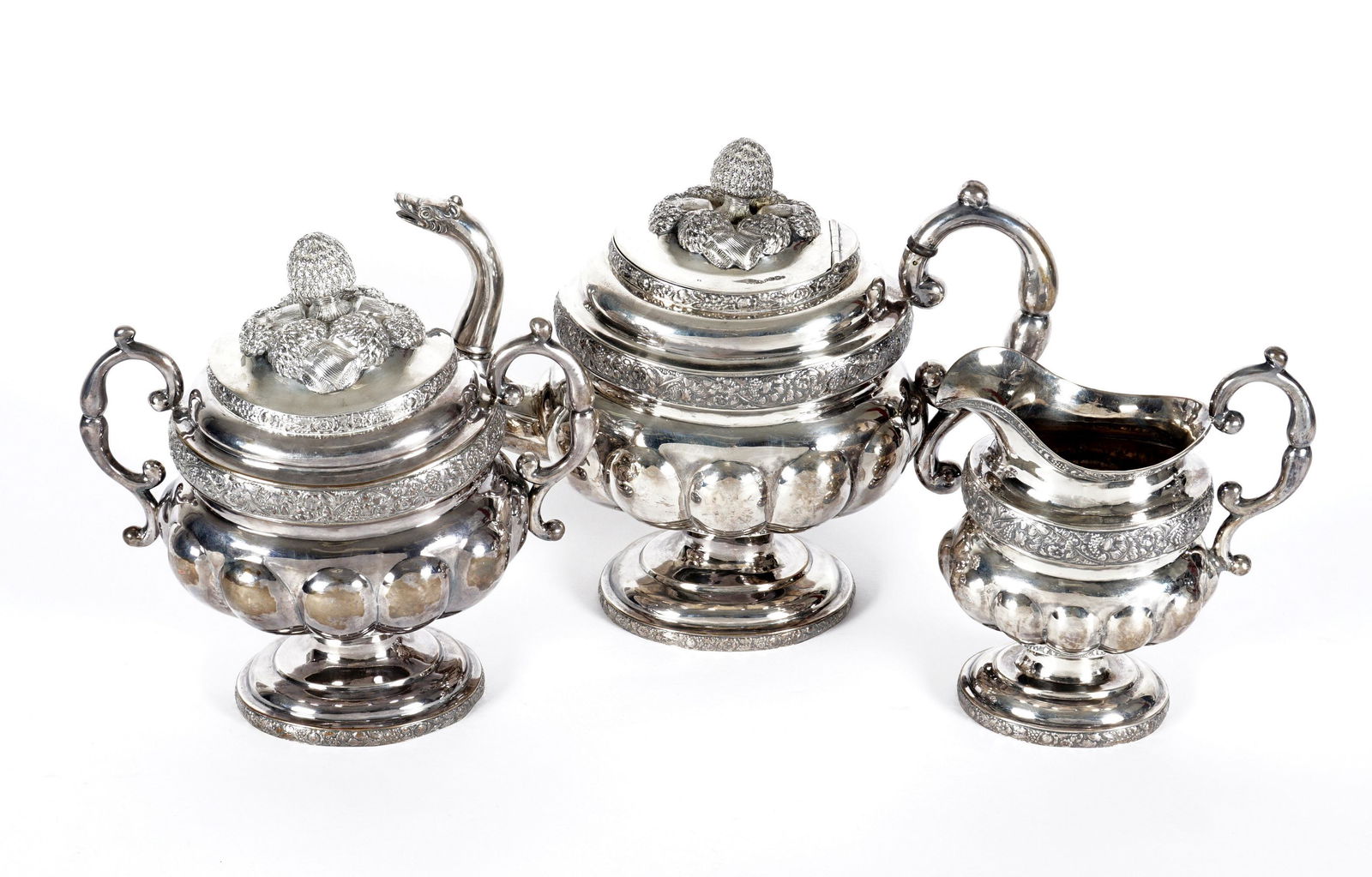 SoldJOHN WESLEY FORBES COIN SILVER TEA SET C.1830JOHN WESLEY FORBES COIN SILVER TEA SET, C.1830, FOUR PIECES, H 5"-10":The coin silver tea service of conforming design; banding of grape bunches and vines to the shoulder of each. Includes 1 teapot, HSee Sold Price