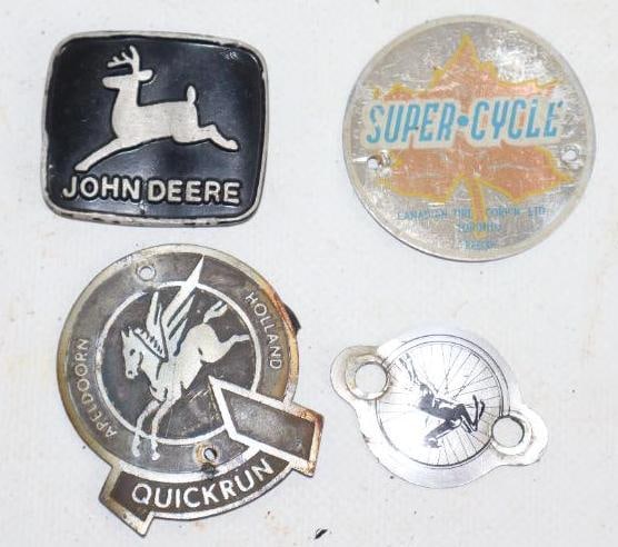 Group of 4 Super-Cycle, John Deere, Quickrun Bicycle Head Badges