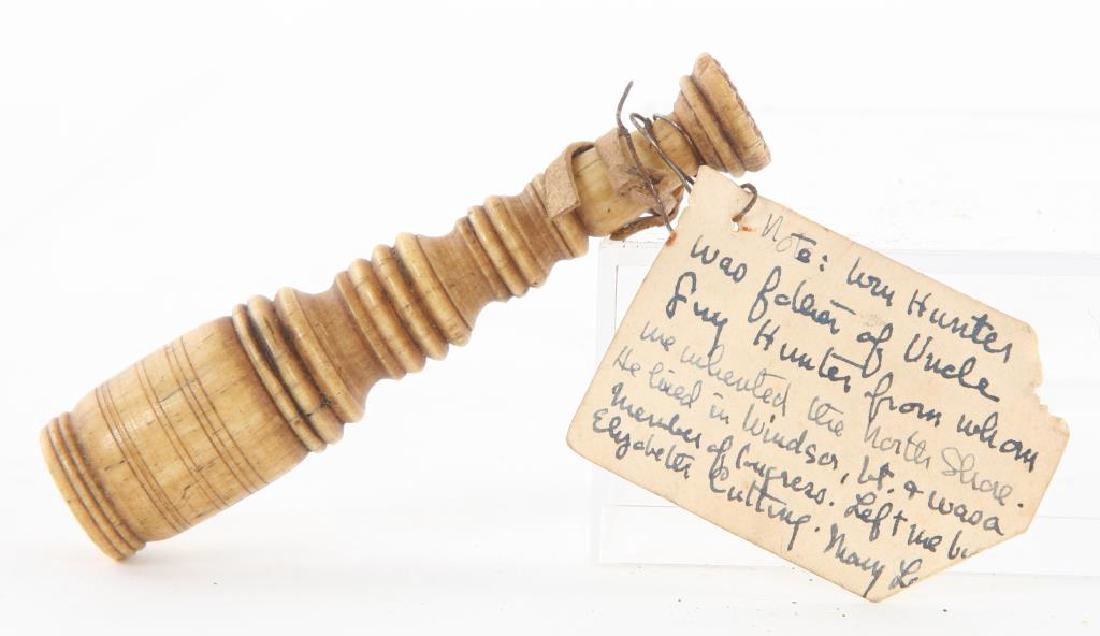 Sold(19th c) WAX SEAL STAMPWaffled stamp with barrel turned handle. 3 1/4 inches. Provenance: William Hunter of Windsor CT.See Sold Price