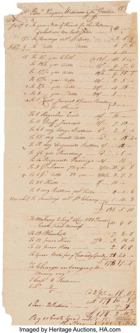Late 18th Century Pennsylvania Colonial Land CaseMar 15, 2026Antebellum Ledger Page Documenting the Sale of SlavesMar 15, 20261834 Estate Return Document Recording Sale of Two Enslaved ChildrenMar 15, 20261835 Estate Inventory Document Including Enslaved Woman Listed as PropertyMar 15, 20261801 New York Financial Letter–Early American Commerce Manuscript CorrespondenceMar 15, 20261775 American Revolutionary War ManuscriptMar 15, 20261791 Boston, Massachusetts Official Senate Vote ReturnMar 15, 20261763 Colonial Connecticut Constable Expense Account to Transport Female Prisoner to NYMar 15, 2026John Hancock Document Signed. Two pages, 9 x 143 days Left1773 Colonial Court Indictment The King vs. McGile, Signed by Attorney General Andrew AllenMar 15, 20261798 Brooklyn NY Insolvency Affidavit Signed by Jacobus L. Lefferts (Founding Brooklyn Family)Mar 15, 2026CSA Surgeon & other documentsMar 02, 2026Peter A. Jay, Son of John Jay Signed Document Dated 1800Mar 15, 20261763 Signed Legal Opinion Bank of England Probate DocumentMar 15, 2026Horatio Nelson Signed Manuscript Orders. Two pag3 days Left1774 New York Bond for 1,600 PoundsMar 15, 2026