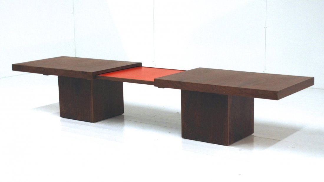 SoldJohn Keal (American, 1917-1983), Expanding Walnut Coffee TableJohn Keal (American, 1917-1983), Expanding Walnut Coffee Table1960s, for Brown Saltman, book-matched walnut veneered rectangular top slides open to reveal a white laminate surface on a double pedestalSee Sold Price