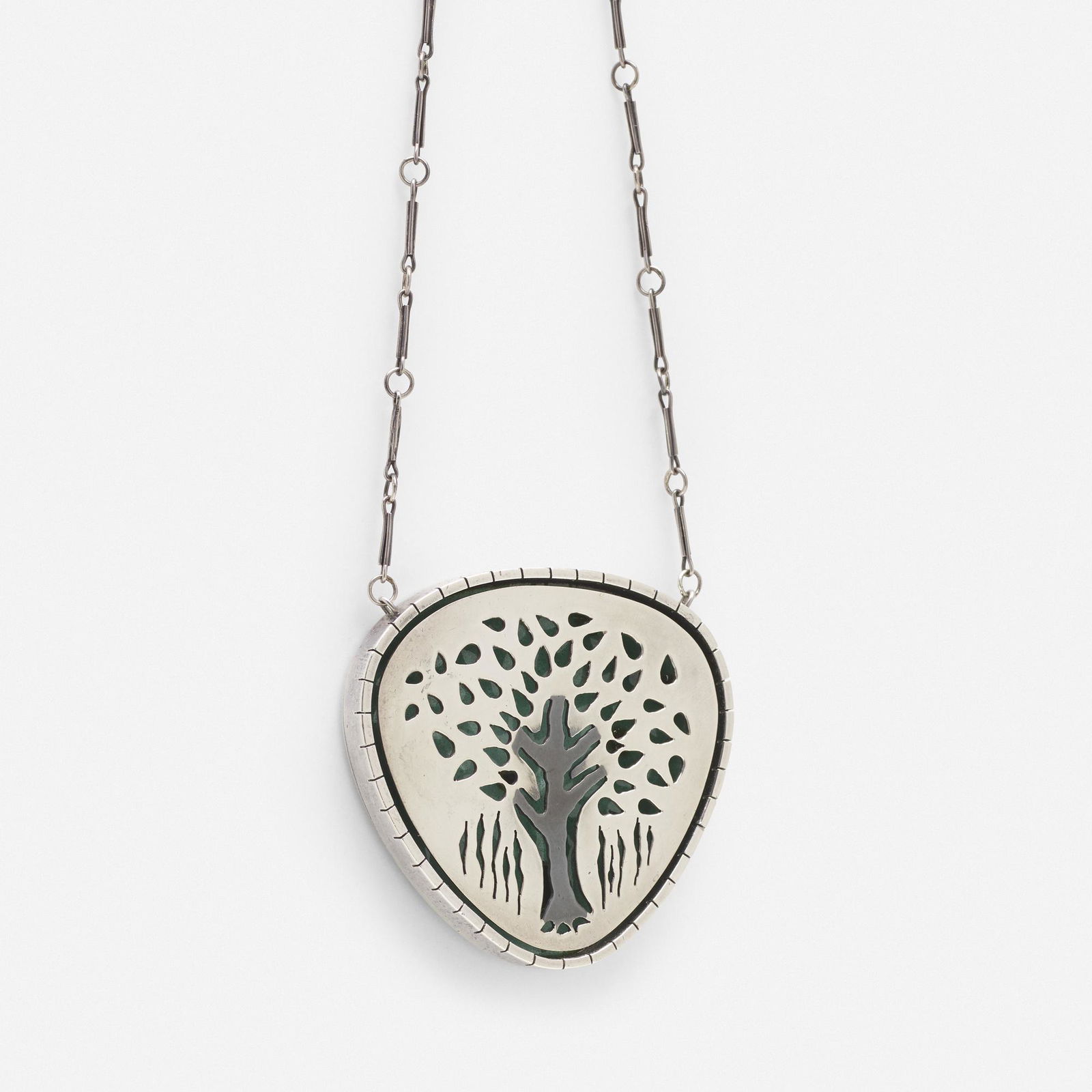 SoldJOHN PAGACZ PEARL & SILVER PENDANTAn oval convex drop with linear applied bright silver, and inset freshwater pearls, on crosshatch engraved patinated silver ground, suspending from fixed X surmount, on black silk cord. Unmarked. 3" xSee Sold Price