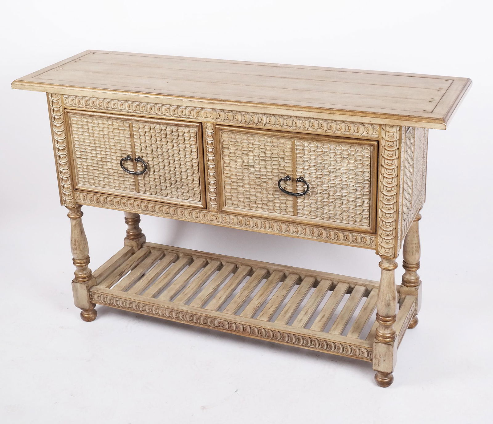 SoldJohn Richards Modern ConsoleJohn Richards modern console carved gilt and painted sideboard, with two deep drawers and lower laddered shelf. [36" H x 56 1/4" W x 18" D]. In good condition. LOCATED AT 150 PRATTSee Sold Price