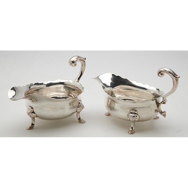SoldJoseph Sanders George II sauce boats, pair 7"w x 4"d xJoseph Sanders, George II sauce boats, pair, London, England, 1740, silver, hallmarked, engraved family crest, 7"w x 4"d x 4.5"h. Provenance: The Warshawsky Collection, Chicago, ILSee Sold Price