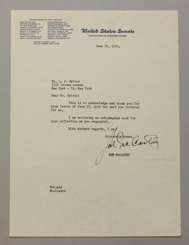 SoldMcCarthy, Joe Signed (Joe) TLS on Senate LetterheadJoseph Raymond McCarthy (1908 – 1957) was an American politician who served as a Republican U.S. Senator from the state of Wisconsin from 1947 until his death at age 48 in 1957. 10.5” x 8&rdquSee Sold Price