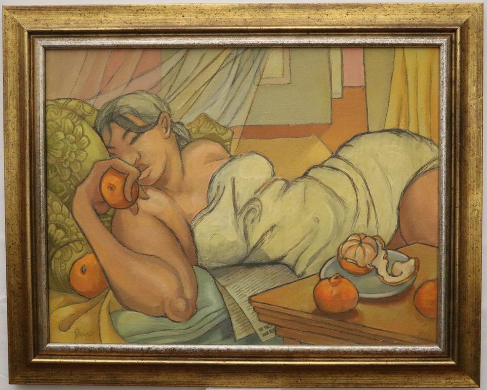 JOSEPH RADOCCIA (American, 1961). Reclining Woman Feasting on Oranges, Oil on canvas. Signed lower