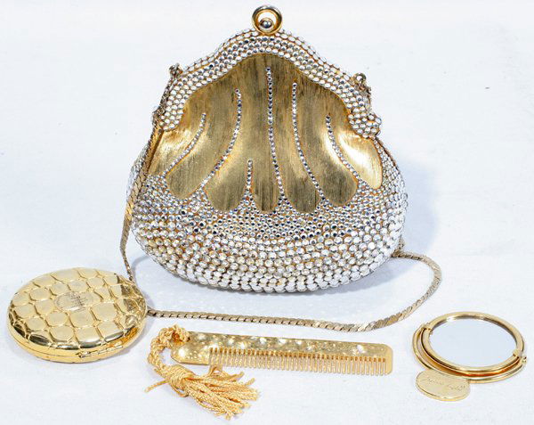 SoldJudith Leiber Rhinestone Evening Bag and AccessoriesThis vintage accessory set includes a dazzling Judith Leiber gold toned and rhinestone evening bag, a matching compact mirror, and a gold-tone comb with a decorative tassel. Renowned for her luxuriousSee Sold Price