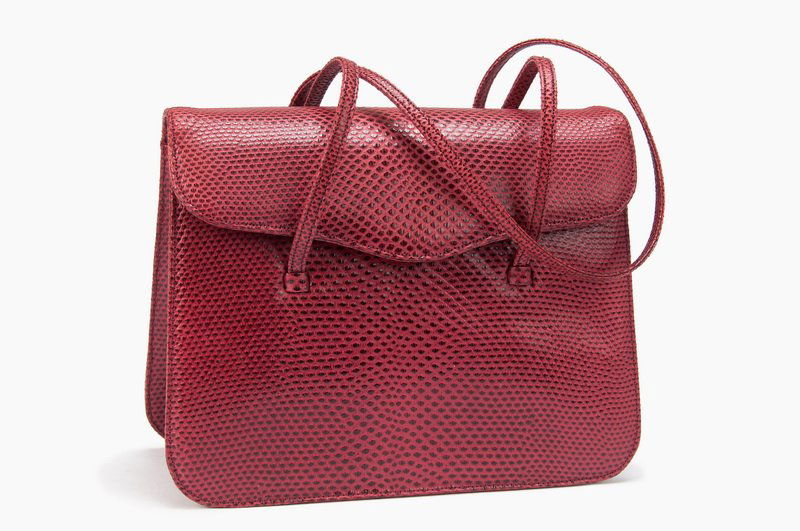 SoldJudith Leiber Lizard Skin Evening BagA vintage red lizard skin frame clutch or evening bag by Judith Leiber. Gold tone hardware, snap closure, red fabric interior, single zip pocket. 5.5 x 8 x 2" 19" strap drop Property from a Woodmere,See Sold Price