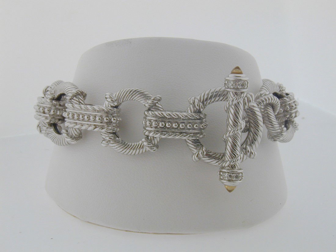 SoldNEW Judith Ripka Sterling Silver Blue Lace Agate Diamonique Toggle Bracelet in the boxDESCRIPTION: BRAND NEW IN THE BOX, STUNNING, Judith ripka large ornate rope textured and Brilliant Diamonique simulated diamonds in a gorgeous open setting. 5 Large beautiful links with a large embellSee Sold Price
