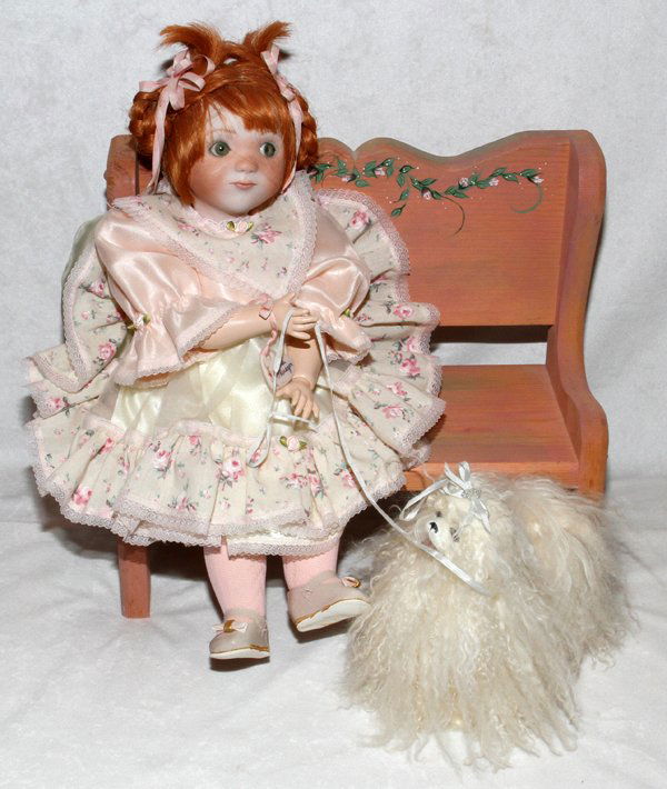 JULIA RUEGER BISQUE HEAD DOLL, SMALL DOG, BENCH