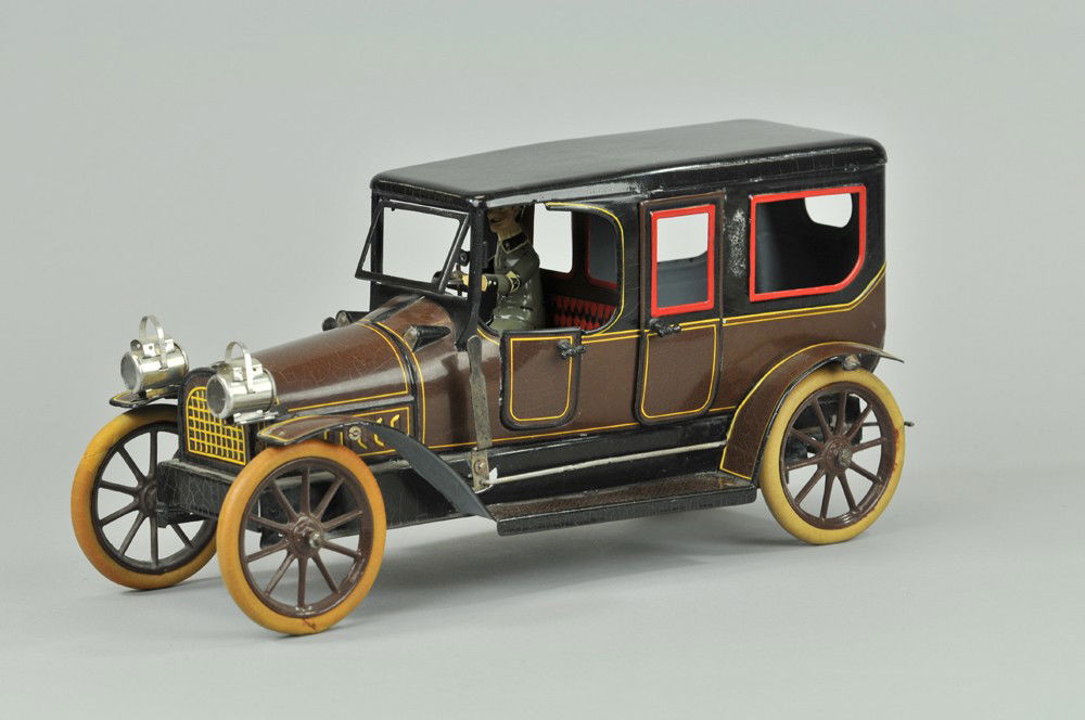 SoldKARL BUB SALOON LIMOUSINE63. KARL BUB SALOON LIMOUSINE | Germany, wind-up motor, early example circa 1915. Provenance: The Donald Kaufman Collection. | 13" l. | Some minor factory touchups at edges of black frame and doors whSee Sold Price