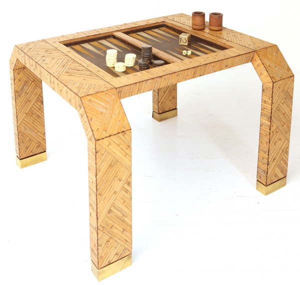 SoldKARL SPRINGER Game tableKARL SPRINGER (1931 - 1991) KARL SPRINGER INC. Game table (checkers/chess/backgammon), New York, 1983 Printed and painted leather, felt, brass Signed and dated 29" x 28" sq.See Sold Price