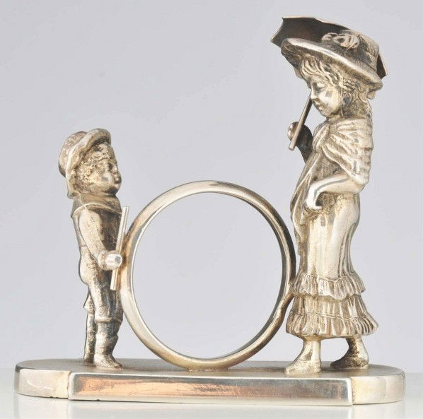 SoldVictorian Silver Plate Figural Napkin Ring HoldersThree Victorian Silver Plate Figural Napkin Ring Holders. 1) Monkey plays a horn, Number 064, maker not marked. 2) Young boy with dog, Meriden Britannia Co. number 199. 3) Kate Greenaway girl with dogSee Sold Price