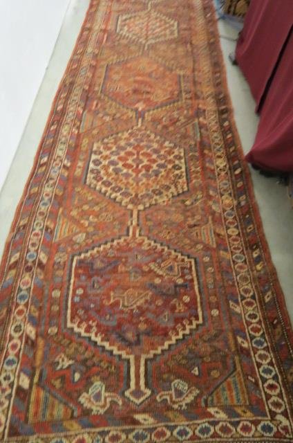 SoldHeriz Persian Handmade Runner,geometric medallions, red field, fancy borders, 2'9" X 12'10".See Sold Price