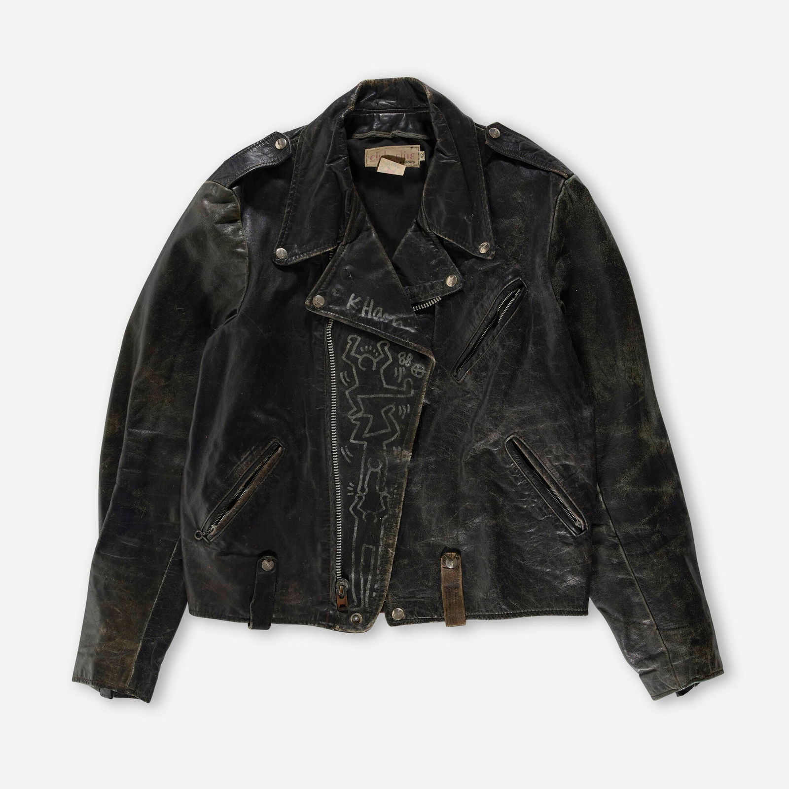 SoldKeith Haring Art, Signed & Dated Bomber JacketLot consists of a Vintage Leather Bomber Jacket, signed and dated on the back by Keith Haring, 1983. Silver metallic marker of "Dog" image on back. Size of jacket is unknown, appears to be a small. ImSee Sold Price