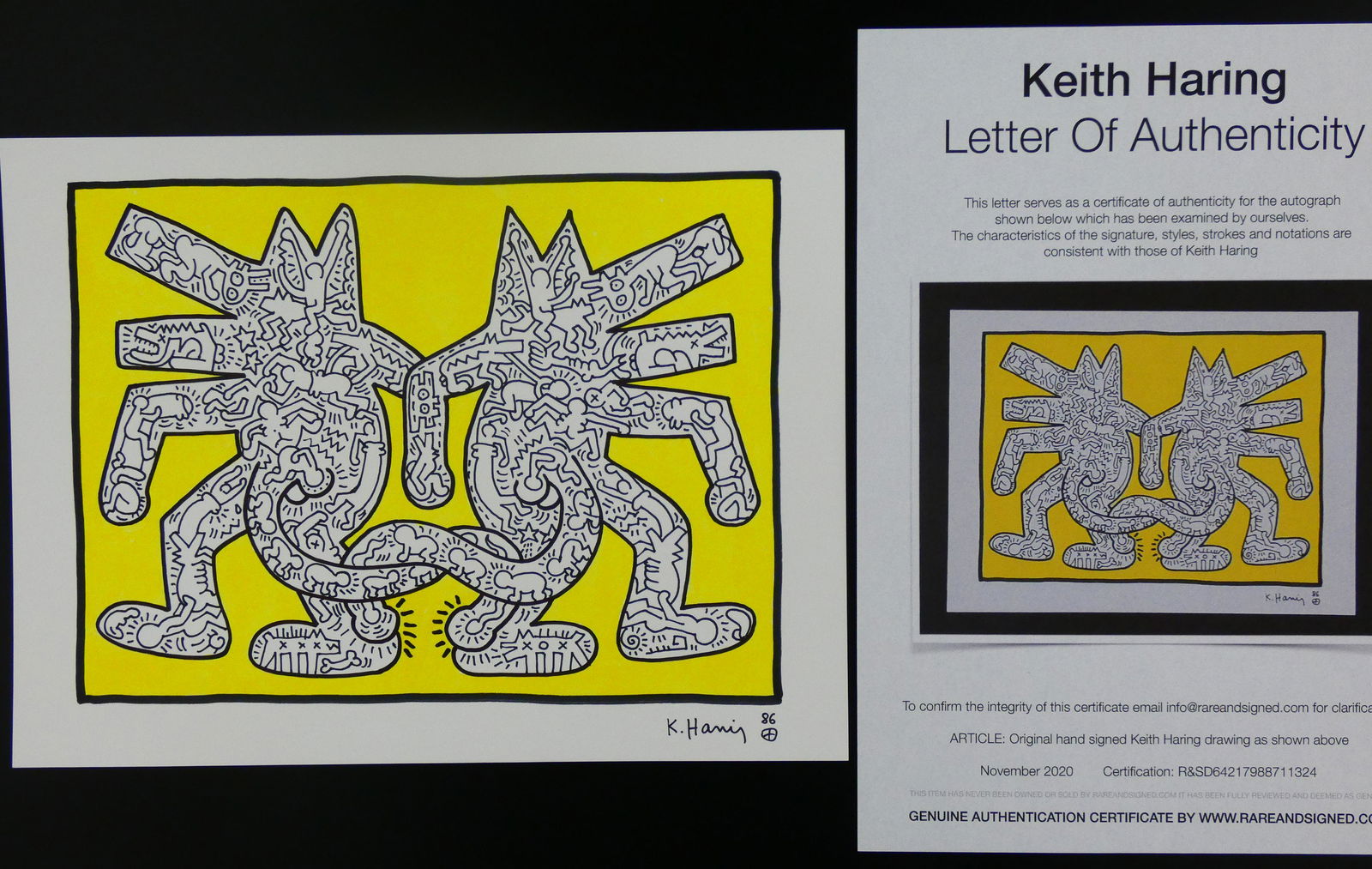 Keith Haring - Two Yellow Dogs - Drawing + COA