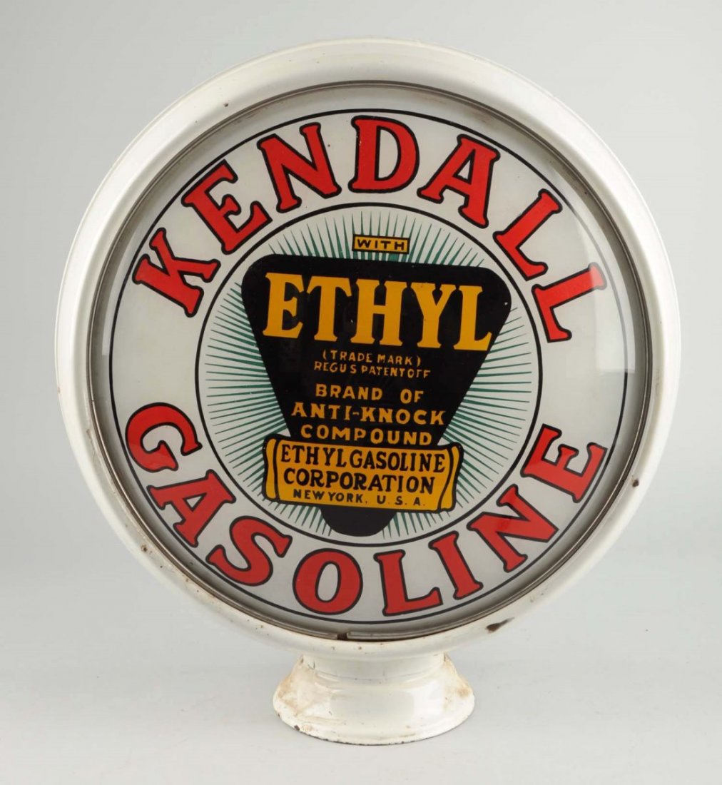 SoldChamplin Gasoline With Ethyl Logo 13-1/2" Globe Lenses.On a wide glass globe body. Both lenses are in very good condition. (9+). 13-1/2" Dia.See Sold Price