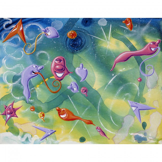 SoldKenny Scharf (AmericanKenny Scharf (American, b. 1958), Earthworldoil on canvas, 1999, signed and inscribed to verso, framed. Stretcher size 21 1/2 x 29 1/2 in.; Frame dimensions 25 1/4 x 33 1/4 in. Kenny Scharf was born iSee Sold Price