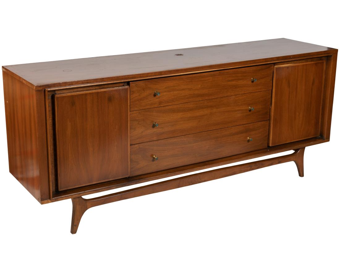 SoldKent Coffey Modern Credenza PerspectaMid Century Modern Credenza from the Kent Coffey Perspecta Collection, signature arches, 2 side cabinet with shelves, and 3 mini dovetailed drawers in the middle (MORT312)(MM) Dimensions: 66" W x 20"See Sold Price
