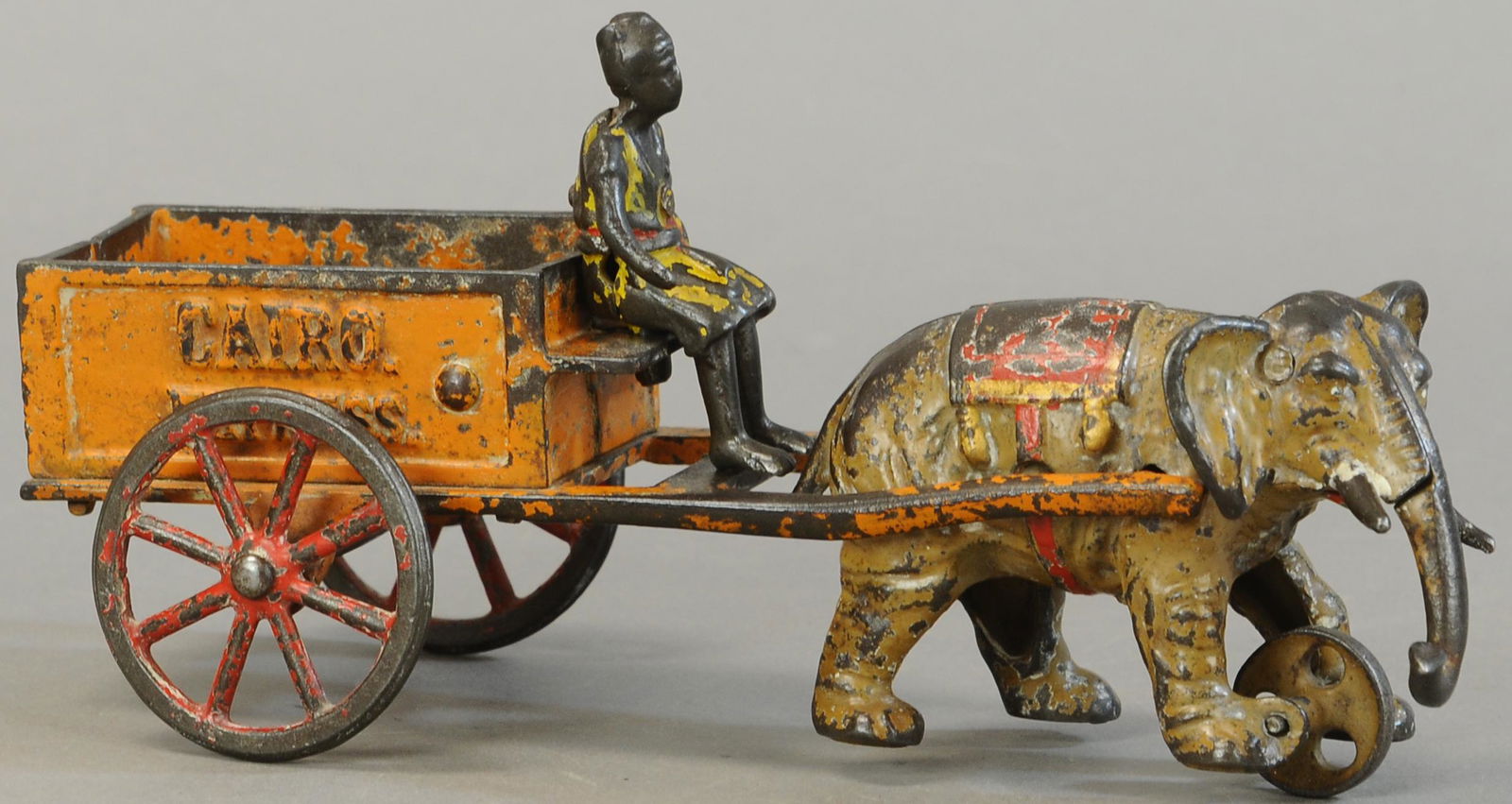 SoldKenton Toys Cairo Express Cast IronLoved pachyderm and express cart with Egyptian driver by Kenton Toys. Circa 1905, this toy is original with proper wheels and working mechanism. The rider and elephant show chipping and play wear, butSee Sold Price