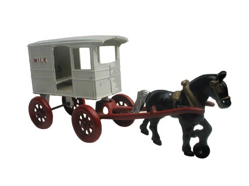 SoldKENTON HORSE DRAWN MILK WAGONPainted cast iron; some minor wear and small rust spots; L-12", VG-EXSee Sold Price