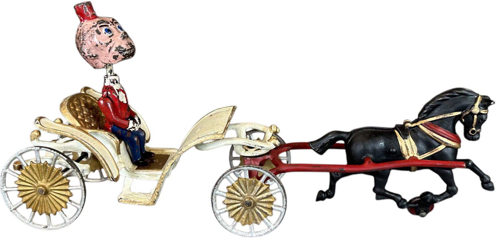 SoldKenton Cast Iron Alphonse Character Nodder Horse & WagonKenton cast iron comic character Alphonse nodding toy cart a.k.a. "nodder". Head moves in nodding action as the toy is moved forward. Chipping to high points and abrasions to horse. Chariot nice creamSee Sold Price