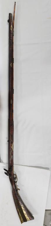 Sold2 KENTUCKY STYLE LONG RIFLES, ONE MASON SYMBOLSTwo American Kentucky and Kentucky style long rifles, comprising, one with a Masonic square and compass inlay to stock and double trigger, apparently unmarked, and one Pennsylvania percussion with a sSee Sold Price