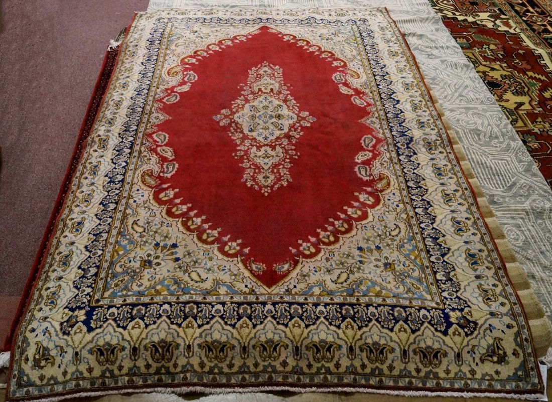 SoldFine Kerman Carpetprobably early 20th century, red ground medallion and spandrels on sandy field, limb, leaf, and bird designs with cobalt and light blue highlights, 8 ft. 4 in. x 12 ft. 5 in.,. Condition: generally unSee Sold Price