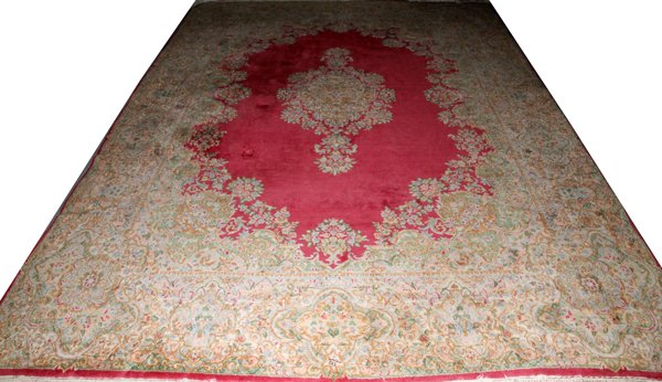 SoldKERMAN PERSIAN WOOL CARPET CIRCA 1920KERMAN PERSIAN WOOL CARPET, CIRCA 1920, W 11' 9", L 19' 7":Imperial Kerman having ivory field, rose border. Closed field with multiple flower motif. Central lantern forms. Hand woven, all wool. From aSee Sold Price